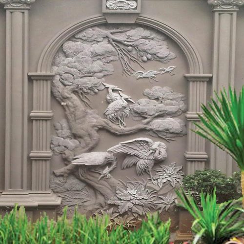 Relief batu alam menghadirkan keindahan alami dengan tekstur dan kekuatan material batu yang tahan lama, sering digunakan untuk motif alam dan klasik.